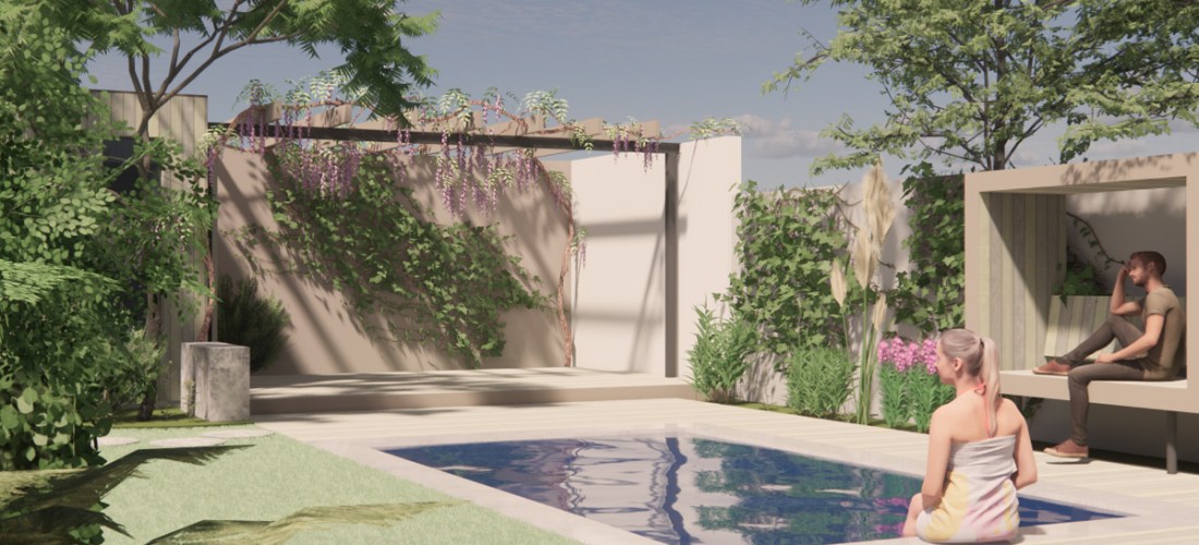 Wat is nog fijner dan in je eigen achter tuin op vakantie te voelen? Atelier Robidoux heeft opdracht gekregen om de achtertuin van een gezinswoning te verbouwen tot een groene paradijs. Het nieuwe zwembad wordt geïntegreerd in het groen en natuurlijke materialen worden toegepast. Comfortabel zithoek, nieuwe schuur, tuin douche en pergola wordt meegenomen in het ontwerp.