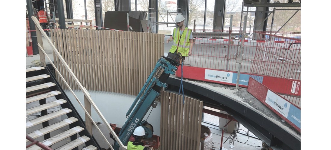 Goed bezig bouwteam! De nieuwe distributie centrum van SIG Benelux wordt geleverd in April en dan kan het uitvoering van het interieur van start. Sommige onderdelen van het interieur plan zijn al goed te zien zoals de prachtige ronde vides en het eiken houten balustrade.